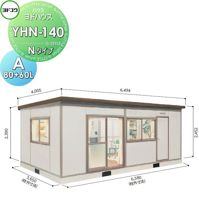 商 品 詳 細商品名ヨドハウス Nタイプ YHN-140A(80+60L) 一般型サイズ(mm)幅6380×高さ2452×奥行き3650 有効室内寸法:幅6292×高さ2100×奥行き3562 建築面積22.73平方メートル(6.89坪)重量(kg)1371発送※送料無料 東海(岐阜県(西濃、岐阜、中濃、東濃地域)・静岡県(一部不可あり)・愛知県全域・三重(北中部))、関西(大阪府、兵庫県南部、京都府(京都市近郊)、関東(東京都・神奈川県(一部不可あり)・埼玉県(一部不可あり)・千葉(中部・北西部)・茨城(南西部))、九州(福岡県)エリア限定、配達のみ対応。詳細はお問い合わせ下さい。 基本は4トン車での配送になりますので乗り付け出来る場所をご指定下さい 配車の都合で4t車以外で配送する場合もございますが事前に車種の確認や指定は出来ませんので予めご了承下さい 上記地域以外のご注文は自動キャンセル致します。備考ご注文の前に必ず別途、ご注文前の確認注意事項をお読み下さい。 注意事項を全てご承諾いただいたとしてご注文は受付致します。 ご不明な点はご注文の前にお電話にてご相談ください。 ※本商品はお客様組立ての商品となっております。 ※メーカーの物流事情により、制約があります。 ・配送可能地域は限られております。 ※上記地域内であっても、離島・山間部や道幅が狭い地域等、配送が不可能な場合もございます。配送の可不可については事前にご確認をお願い致します。 ・お届けは平日の日中(9時~17時頃まで)のみです。土日、夜間の配送はできません。 ・ご不在のお届けはできません、必ずご在宅の日にちを確認致します。 ・できるだけお客様のご希望日にお届けできるように手配致しますが、 ご希望に添えない場合もございます。 ・配送の時間指定はできません。配達日には必ず1日ご在宅下さい。 ※道幅が狭いなど、商品を運ぶトラックの通行が困難と思われる場合、事前にご相談ください。 ・基本は4t車の運搬になります。 ・敷地内や玄関前までトラックが着けない場合はお客様の責任でお運びいただきます。 ※ビル・マンション等へのお届けは、1階エントランスでのお渡しとなります。 2階以上にはお客様にてお運び下さい。 ※お客様都合の返品は如何なる理由でもお受けしておりません。 ※必ず設置可能か、ご購入前にお確かめ下さいませ。 ※組立には、専門的な知識と、道具、技能が必要となります。組立は専門業者にご依頼下さい。 ※必ず、部品箱内の【組立説明書】に手順に沿って、組み立てを行ってください。 ※必ず、説明書をお読み頂きご使用くださいませ。ご注意事項・商品画像について:商品イメージ画像には製品以外のブロックや基礎、土間、換気扇、小物等等やオプションの小窓、樋等が映っている物がございますが各製品の基本仕様以外の物は価格に含まれておりません。基本仕様をご確認頂き変更をご希望の場合はご注文前にお問い合わせ下さい。・確認申請について:建築基準法の規定により建築確認申請の手続きが必要な場合があります。また、用途地域により様々な制限をうけますので、ご購入前に各市町村の建築課にご相談ください。施工について※施工はお客様にて責任を持ってご手配ください。 ※施工には、専門的な知識と、工具、技術が必要となります。 ※お近くの施工業者様に設置を依頼して頂くようお願い致します。 ※お近くの施工業者様に相談の上、設置を依頼して頂くようお願い致します。関連商品検索はこちらから 可愛い・おしゃれな物置を多数準備 屋外設置の大型・小型物置きやガレージやゴミ集積所用商品を取り揃えております。商品作成準備中の物もございますのでご希望の商品が見つからない場合はお問い合わせ下さい。個別見積り致します。 【イナバ物置 稲葉製作所】アイビーストッカー・タイヤストッカー・シンプリー・ナイソー・ナイソーシスター・ネクスタプラス・フォルタ・ドマール【タクボの物置 田窪工業所】グランプレステージジャンプ、ドアーズ・Mr.ストックマン・ペインタ・Mr.トールマン・・シャッター式扉物置・クリーンキーパー・ガレージ倉庫 ベルフォーマ・カールフォーマ・自転車置き場【ヨドコウ・ヨド物置(淀川製鋼所)】エスモ・エルモ・エルモシャッター・ ★物置・倉庫 売れてる人気ランキングはこちら ●タクボ物置(田窪工業所)の商品一覧●イナバ物置(稲葉製作所)の商品一覧●ヨドコウ・ヨド物置(淀川製鋼所)の商品一覧 ●サンキン物置のカテゴリ一覧●ディーズガーデン 物置のカテゴリ一覧※ ヨド・イナバ物置・配達注意事項