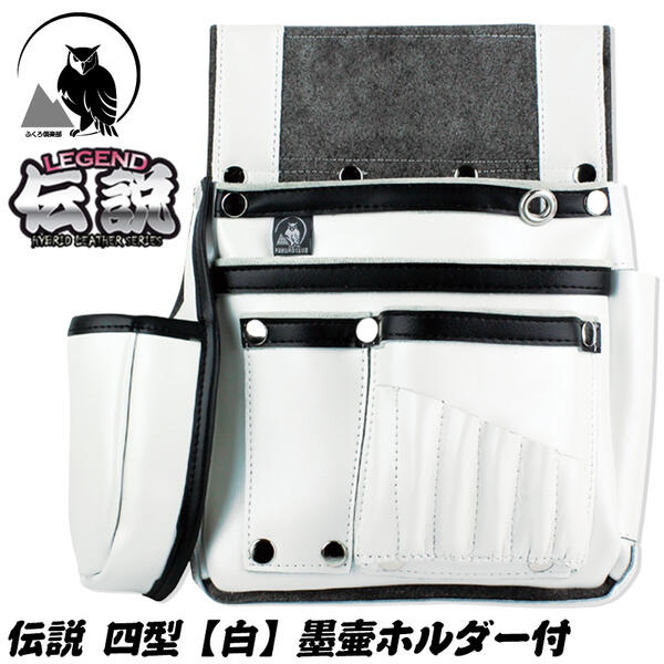 ■ふくろ倶楽部 伝説 四型 白 墨壷ホルダー付き 本革+マイクロレザー仕様 腰袋 釘袋 かっこいい 大工 建築 腰道具 スミツボ ビットポケット付き 釘を通さない ホワイト HB-034W ヒマサ金物