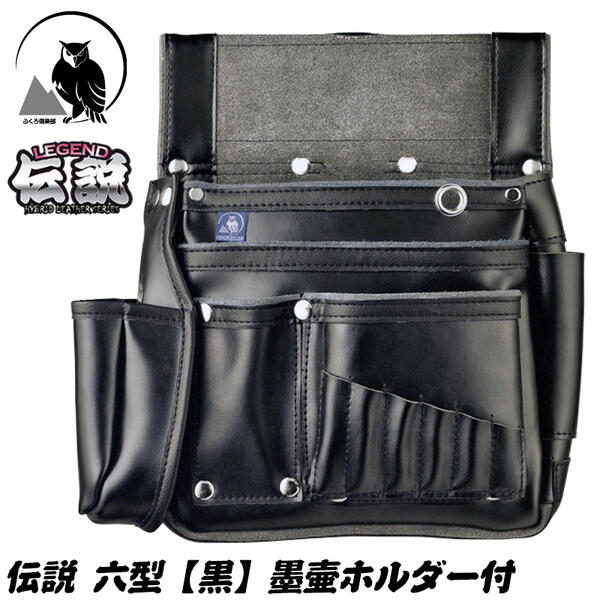 ■ふくろ倶楽部 伝説 六型 黒 墨壷ホルダー付き 本革+マイクロレザー仕様 腰袋 釘袋 かっこいい 大工 建築 腰道具 スミツボ ビットポケット付き 釘を通さない ブラック HB-036K ヒマサ金物