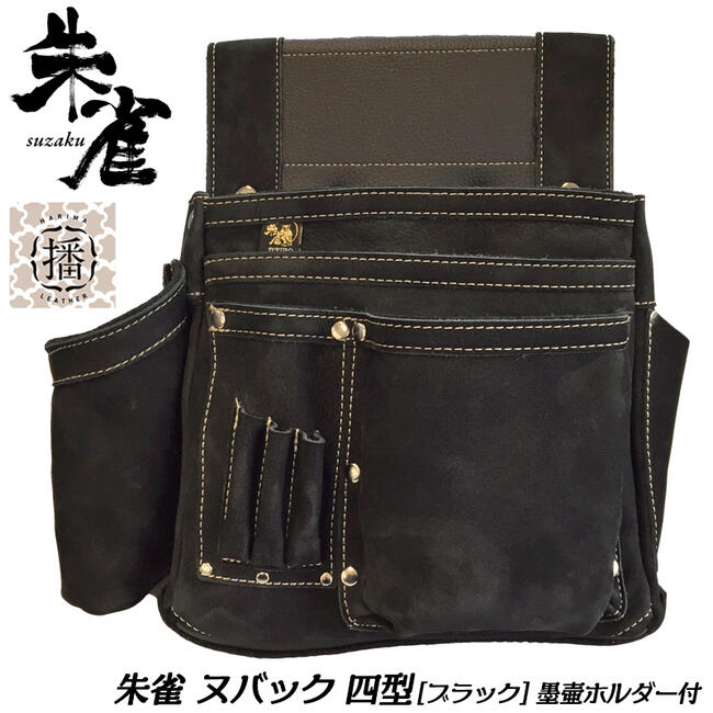 ■ふくろ倶楽部 朱雀 新型ヌバック 四型 墨壷ホルダー付 黒 320x220x50 ヌバックレザー 人工皮革 二枚張り 大工 腰袋 釘袋 腰道具 ブラック 高品質 日本製 SZN-834K ヒマサ金物