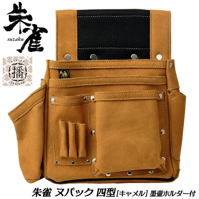 ■ふくろ倶楽部 朱雀 新型ヌバック 四型 墨壷ホルダー付 茶 320x220x50 ヌバックレザー 人工皮革 二枚張り 大工 腰袋 釘袋 かっこいい 腰道具 キャメル 高品質 日本製 SZN-834 ヒマサ金物
