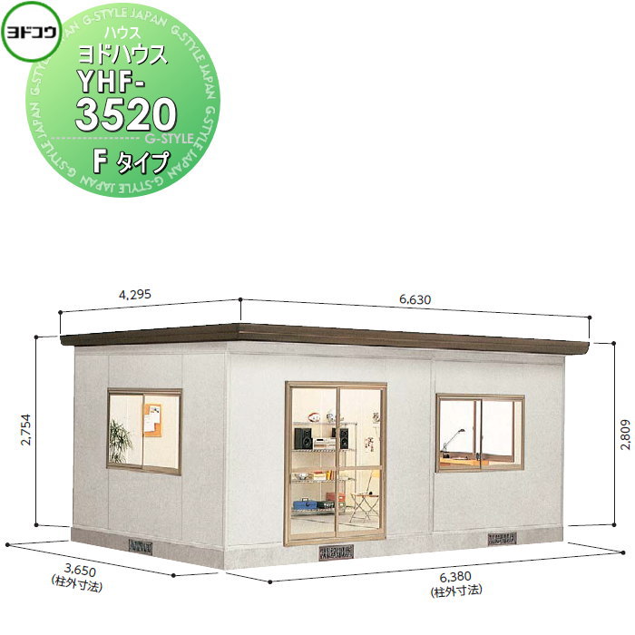 商 品 詳 細商品名ヨドハウス Fタイプ YHF-3520 一般型サイズ(mm)幅6380×高さ2809×奥行き3650 有効室内寸法:幅6292×高さ2389×奥行き3562 建築面積22.73平方メートル(6.89坪)重量(kg)1622発送※送料無料 東海(岐阜県(西濃、岐阜、中濃、東濃地域)・静岡県(一部不可あ...